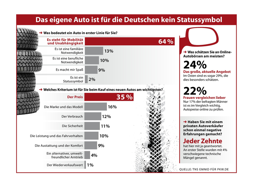 Die allermeisten Bundesbürger (64 Prozent) dagegen schätzen das Automobil vor allem als Garant für Mobilität und Unabhängigkeit, ergab die Umfrage. Für Frauen spielt dabei der Faktor Mobilität eine noch größere Rolle beim Autokauf als für Männer. 67 Prozent der Umfrageteilnehmerinnen nannten ihn an erster Stelle, während es bei den Männern 60 Prozent waren. Im Ost-West-Vergleich zeigt sich, dass mobil zu sein für die Bewohner der alten Bundesländer (65 Prozent) einen höheren Stellenwert hat als für die Menschen in den neuen Bundesländern (59 Prozent).