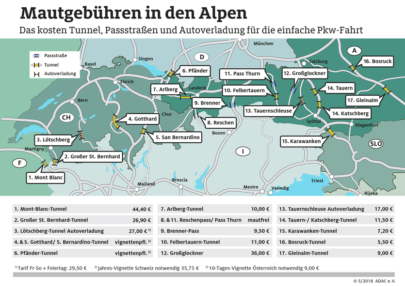 Für die wichtigsten Verbindungen hat der ADAC nun diese Grafik mit den aktuellen Kosten zusammengestellt (Mai 2018).
